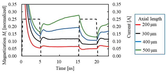 Figure 8 is a schematic diagram of the amorphous wire with a diameter of 12 µm. The axis length was changed from 200 to 500 μm. In this section, we set the easy axis on the surface of the wire to the in-plane direction and the easy axis in the inner wire to the axial direction, reflecting the effect of the compressive stress of the actual wire. The surface thickness of the wire was assumed to be 0.9 μm, which was identical to the ratio of the sensor diameter and the surface layer thickness in a previous study []. We also considered a smaller ratio than in another study (60 μm in diameter) []. In the future, we will study the relationship between the output voltage and surface thickness. The cell size for dividing the model was 0.2 μm × 0.2 μm in the in-plane direction, and the number of divisions in the axial direction was examined. Almost the same calculation results were obtained for 8 or more layers, but in this study, the model was divided into 16 layers. The initial magnetization direction was the +z-axis direction.