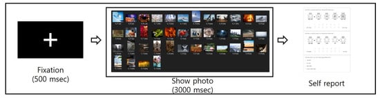 We collected photos by referring to the stimuli model of the IAPS to evaluate self-awareness []. IAPS provides a set of emotional stimuli involving attention and emotion, ranging from scenes of nature to household objects. Because we aimed to select stimuli for the self-awareness of participants’ emotions, we excluded stimuli with facial expressions, thereby distinguishing from recognizing others’ emotions. A total of 120 candidate stimuli were selected, with 30 stimuli for each of the four emotional domains. The participants viewed the black cross at the center of the screen for 500 msec to fixate their gaze. They then viewed the candidate stimuli for 300 msec. We referred to the exposure time based on a previous study [].