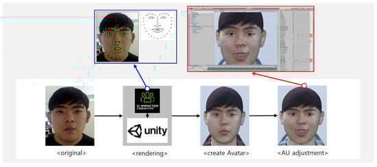 The facial expressions of each domain were made into avatars. We referred to the two-dimensional model of facial emotion [], in addition to the action unit (AU) of the facial action coding system (FACS) [,,]. Figure 2 outlines the process of creating a standardized, expressive facial avatar. The avatar was ported to Unity to create a face in Character Creator 3 by adjusting the AUs. Facial expression intensity was produced using the AU parameter provided by Unity at ten intensity levels, at equal intervals from 10 to 100.