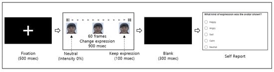 Figure 3 outlines the experimental procedure for normalizing the intensity of the facial expression. The experimental environment was the same as that used in the first experiment. In random order, we displayed an avatar stimulus with varying emotion intensity. For 900 msec, the stimulus expression changed from neutral to target and was maintained with a 100 msec pause [,]. Before showing the avatar, a black cross was shown in the center of the screen for 500 msec, and the same black cross screen was shown for 300 msec after exposure to the stimulus.