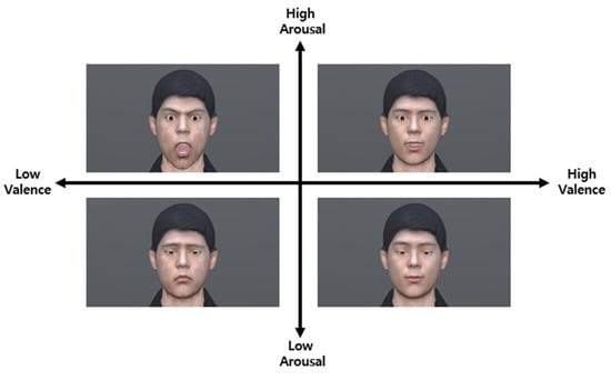 In the first experiment, based on the IAPS model [], we verified and selected photo stimuli to comprehensively evaluate the ability to recognize emotions (level 1) and express them well (level 3). In the second experiment, we chose stimuli that could comprehensively assess the ability to recognize the emotions of others (level 2) and express their own emotions well (level 3). Specifically, facial expressions were standardized based on the two-dimensional emotional model using avatars, and facial expression stimuli were defined by normalizing the intensity of the facial expression.