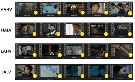 Five video clips that would elicit emotions in the participants (e.g., dramas or films) were selected for each dimensional domain (see Figure 5). After watching each candidate video clip, participants were asked to rate their valence and arousal level using a 7-point Likert scale questionnaire. Additionally, they were asked to select a keyword representing one of the four dimensions. Only responses that matched the intended emotion were scored. We selected five video clips with the highest scores per dimension, where facial expressions corresponding to the target emotion were observed in over 50% of the frames.
