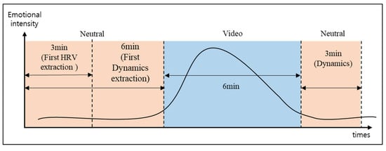 Figure 6 outlines the emotional stimulus structure created to extract HRV and dynamics. To extract HRV, the length of the video clip was 6 min. In addition, to extract the dynamics, neutral video clips were attached 6 min before and 3 min after the stimuli. A neutral video was produced as an atypical black-and-white video to prevent drowsiness. In summary, we selected 20 stimuli, 5 per emotional domain and candidate emotion-eliciting stimulus.