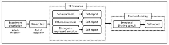 Figure 7 outlines the overall experimental protocol. To confirm the EI normality of the recruited participants, their self-recognition ability was evaluated using the EQ-i of the Bar-On model. The sum of the scores of three items (self-awareness, others-awareness, and distinguishing the expressed emotion) was used to evaluate the EI. Participants then viewed the emotion-eliciting stimuli.