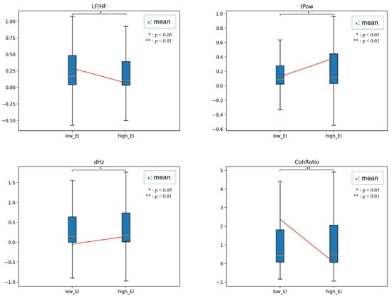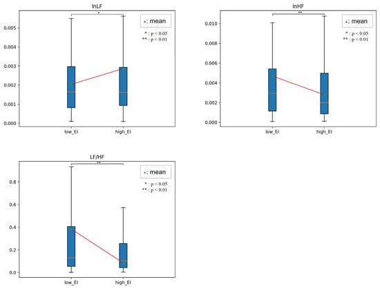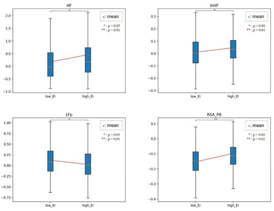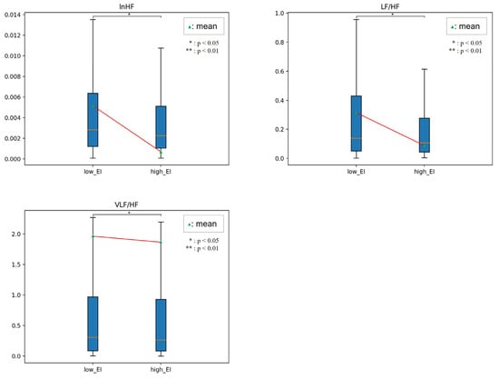Table 8 presents the analysis results for the two EI groups. In related EI studies, humans in the high EI group reported that HF, LF/HF, and RSA, reflecting vagal tone, were higher than those in the low EI group [,]. In our study, emotional regulation ability was not limited to stress or mental or neurological lesions. Instead, we used emotion-eliciting stimuli based on a two-dimensional emotional model.