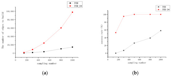 The comparison of the number of edges constructed by PRM and PRM-D* for different numbers of sampling points with the success rate in Figure 7d revealed that the number of edges for PRM at 1000 sampling points was more than twice the number of edges for PRM-D* at 500 sampling points; however, the success rate of PRM was only 0.6 times that of PRM-D*, and combined with Figure 8, it could be seen that the traditional PRM method had fewer effective edges at corner locations. After the improvement, the number of corner edges increased.