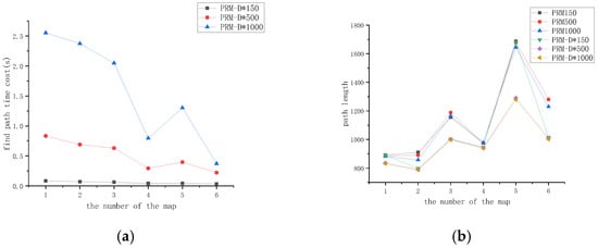 Figure 11b depicts variations in the path length for PRM-D* and PRM for different numbers of sampling points. Overall, the path length of PRM-D* was smaller than the path generated by PRM regardless of the number of sampling points and the complexity of the maps, which proves that the original PRM path was optimized after incorporating the D* algorithm. Looking at each map alone, the increase in the number of sampling points had a greater effect on the PRM path length, while the impact on PRM-D* was smaller, which proved that the optimization of D* based on the original path of PRM was sufficient to compensate for the optimization results of the PRM path, which was caused by an increase in the number of sampling points by a certain amount.