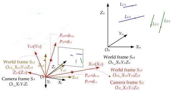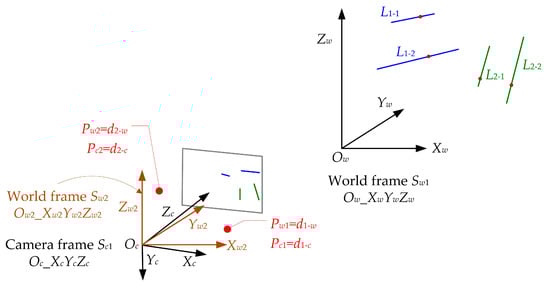 In addition, according to the unit direction vectors, we established two virtual spatial points plotted in red in Figure 3. Their coordinates, both in the camera frame Sc1 and world frame Sw2, are also shown in Figure 3, and then their transformation can be written as