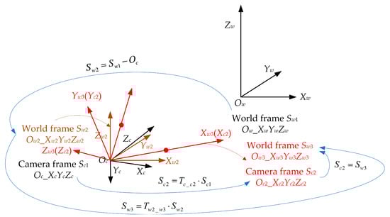 A new world frame, Sw2 (Ow2_Xw2Yw2Zw2), is established in Figure 3. It is parallel to the original world frame Sw1, and only translation exists between the two world frames. When the origin of the world frame Sw2 is located at the camera position Oc, we can obtain the transformation between the two world frames as follows.