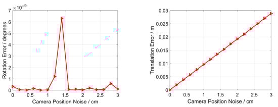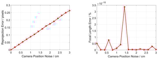 Here, Gaussian noise, whose deviation level varies from 0 to 3 cm, is added to the camera position. For each noise level, 10,000 random trials are independently performed. Then, the mean errors of rotation, translation, reprojection and focal length are reported in Figure 6.