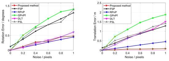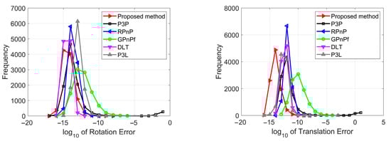 In this section, according to the minimal set of 2D–3D correspondences for each method, three 2D–3D point correspondences, four 2D–3D point correspondences, five 2D–3D point correspondences, six 2D–3D point correspondences, three 2D–3D line correspondences and two 2D vanishing point-3D line correspondences are randomly selected from the synthetic data for P3P, GPnPf, RPnP, DLT, and P3L and our proposed method, respectively, for each trial.