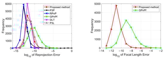 We tested our proposed method in terms of numerical stability in this section. A total of 10,000 trials were performed independently using synthetic data with no noise added. The performance of the rotation, translation and projection estimation was compared to the other five methods, and the performance of the focal length estimation was compared only to the GPnPf method because the other four methods could not estimate the focal length. The results of numerical stability are reported in Figure 7.
