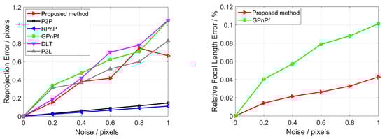 We tested our proposed method in terms of noise sensitivity in this section. The trials were performed independently using synthetic data with noise added. Noise may exist in the 2D feature or 3D feature. Because the 3D feature will be transformed into a 2D feature, 2D noise can reflect the 3D noise. Hence, we only added zero-mean Gaussian noise onto the 2D points and lines, and the noise deviation level varies from 0 to 1 pixel. A total of 10,000 trials were performed independently for each method, respectively, and the performance of the rotation, translation and projection estimation was compared to the other five methods. The performance of the focal length estimation was compared only to the GPnPf method because the other four methods could not estimate the focal length. The results of noise sensitivity are reported in Figure 8.