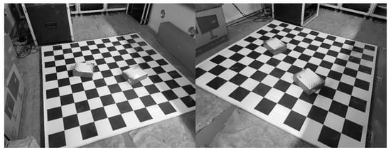 First, many lines and points, whose positions are known as ground truth, were placed in the FOV, and then we chose some of them to estimate the pose and focal length for our proposed method and other SOTA methods. After estimating, stereo vision [] was used to measure the 3D positions of the left points as the measured values. The accuracy of the measured value is affected by the camera’s pose and focal length. The pose and focal length were estimated by our proposed method and other SOTA methods. Hence, the measurement accuracy between the measured value and ground truth can reflect the accuracy of our proposed method. Next, we set up the real scenarios and captured real images from two different views by the cameras [], shown in Figure 9.