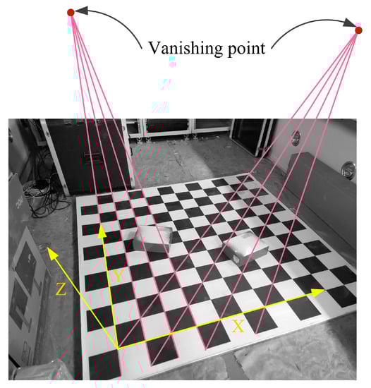 The checkerboard was placed in the FOV, and the size was known. Hence, there are many sets of parallel lines, and their unit direction vectors are known. We chose two sets for our proposed method to estimate the focal length and pose, as shown in Figure 10.