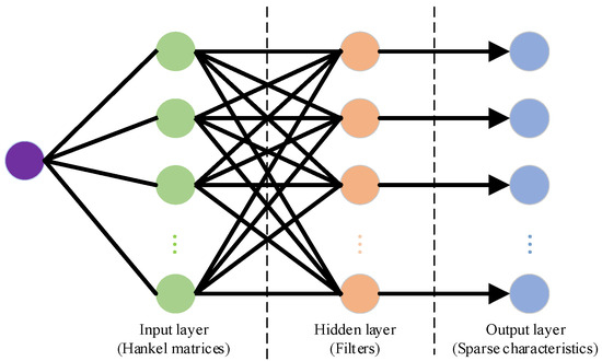 Convolution sparse filtering is an enhancement of sparse filtering based on multidimensional blind deconvolution theory. Multidimensional blind deconvolution can be represented as the monolayer network, as displayed in Figure 1. The input layer is the Hankel matrix composed of the vibration signals, which are applied to activate characteristics through convolution with the hidden layer. The equation of feature extraction of the convolution sparse filtering method is as follows: