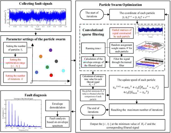 Compared with EMD, FK, and VMD, the CSF shows superior performance in terms of excellent robustness to the signal of outliers and independence from prior knowledge. However, the superior property of the CSF is seriously affected by the unsuitable length of filter L and the number of filters . The diagnosis accuracy and health monitoring effectiveness of the CSF is limited by the inappropriate filter length. Although the result of feature extraction becomes more accurate with the increase of the number of filters , the calculation time also increases. Therefore, it is essential to determine the appropriate [L, ] for the CSF to extract the fault features efficiently and accurately. To address the issue of the parameter selection of CSF and further expand its application in the extraction of the bearing failure feature, the parameter Adaptive Convolution Sparse Filtering (ACSF) method is proposed. Firstly, the novel metric entropy–time function () is proposed to measure the signal filtered by the CSF. Compared to the existing metrics, the proposed metric considers both the accuracy and efficiency of fault extraction. Then, the PSO with superior global optimization performance is used to detect the filtered signal with the minimum  value. Finally, the bearing fault is diagnosed according to the envelope spectrum of the signal with minimum .