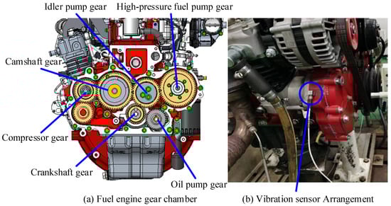 In this section, the fault feature extraction capability of the proposed method for modulated signals is verified by the abnormal noise data from the gear chamber of a 2.5 L diesel engine. The diesel engine gear chamber profile and sensor installation position are shown in Figure 4. The crankshaft gear serves as the power input to the gear chamber. In this experiment, the crankshaft speed  = 2400 rpm, sampling frequency  = 51,200 Hz, sampling time t = 1 s. The number of teeth of each gear in the gear room and the fault characteristic frequency at this speed are shown in Table 1.