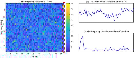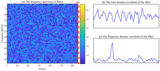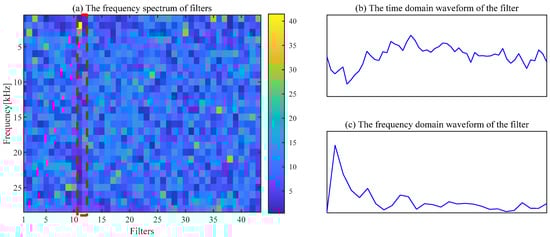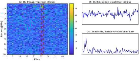The filtering effect of CSF is seriously affected by the selection of parameters, and fault features cannot be extracted by CSF with the default parameters. The spectrum of the trained filters with [L, ] = [200, 43] is shown in Figure 9a. The waveform of the 26th filter with a significant frequency component is exhibited in Figure 9b,c. The regular shocks are not extracted in the time-domain signal, as displayed in Figure 10a. The necessity of the appropriate parameter selection for the CSF is confirmed by this phenomenon.