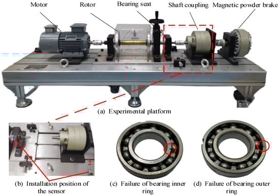 The experimental bench shown in Figure 11a is used to collect bearing fault signals to further demonstrate the superior performance of the ACSF. The experimental bench mainly includes a motor, vibration sensor, bearing pedestal, signal acquisition system and magnetic powder brake. The installation position of the sensor is displayed in Figure 11b. The sensor at position 2 is used to collect experimental signals. The bearing parameters employed for the experiments are listed in Table 2.