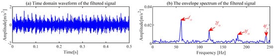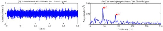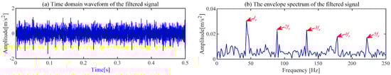 The proposed ACSF method is used for the fault signal of the bearing outer ring. The minimum value of  ( = 2.5032) occurs in the 22nd generation, and the most appropriate [L, ] is [106, 65]. The frequency spectrum of the filters trained under this parameter is shown in Figure 19a. The 65th filter in this figure has obvious frequency components. The waveforms of the 65th filter are exhibited in Figure 19b,c. The original signal filtered by this filter is exhibited in Figure 20. Compared with Figure 18a, the noise component in the waveform of the time domain is suppressed, and the regular shocks triggered by the fault become distinct. The demodulation of the filtered signal is displayed in Figure 20b, where the frequency of failure characteristics can be clearly reflected compared to Figure 18b.