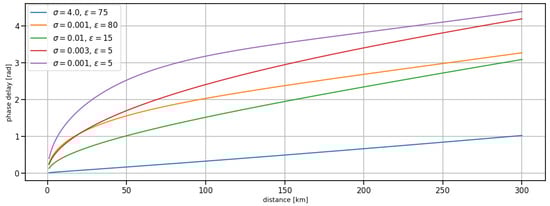 The effect of ground wave propagation in the long- and medium-frequency band has been discussed extensively in the literature. Wait [] provided a detailed overview of the evolution of theories related to electromagnetic ground wave propagation. The attenuation of a wave travelling along the interface of the earth’s surface and the atmosphere is caused by the finite complex surface impedance, consisting of the dielectric permittivity and the conductivity of the ground. The term “attenuation” is a complex valued factor, involving the introduction of an amplitude damping and a phase delay in addition to the free space propagation loss of a wave. To obtain the AGDF for the MF R-Mode system, we want to derive a method to calculate the phase of the complex attenuation function.