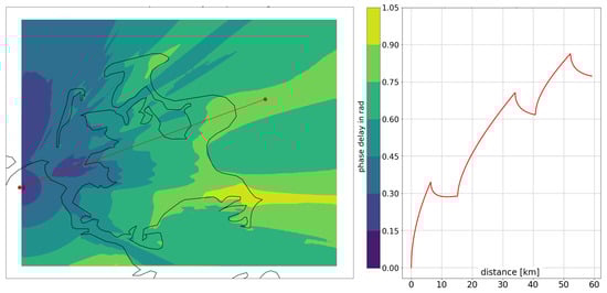 (Left) Two-dimensional map of the phase delay of the ground wave with respect to free space in the area of the German island of Rügen. The red line illustrates an example path between the R-Mode transmitter (left red dot) and a hypothetical vessel position east of the island. (Right) Ground wave phase delay for the same propagation path over distance.