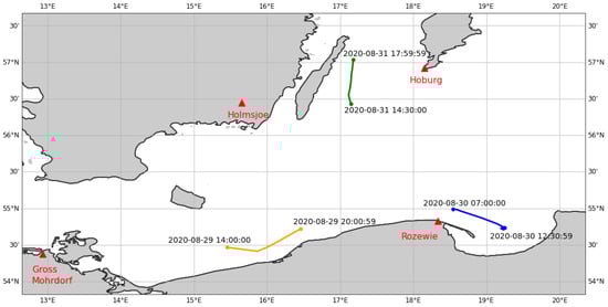 Ground track of the ship “Fyrbygarren” in the Baltic Sea during the MF R-Mode measurement campaign on August 29th (orange), 30th (blue), and 31st (green), 2020. The MF R-Mode transmitters that were used are marked as red triangles.