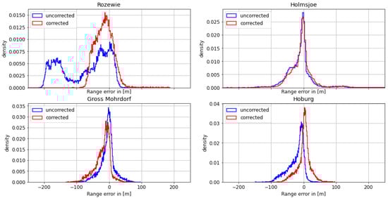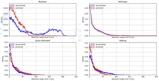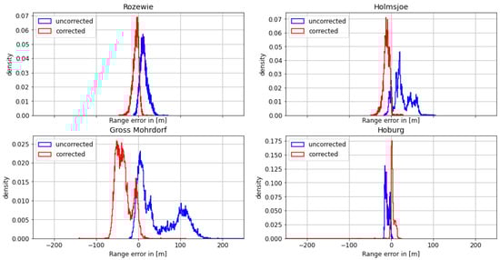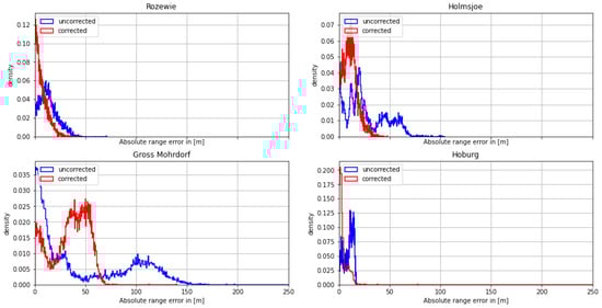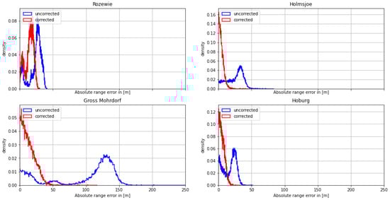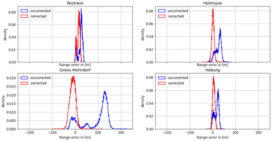 On the morning of August 30th, the ship continued its path along the Polish coast and turned south into the Bay of Gdansk. As depicted in Figure 9 and Figure 10, the range estimates of the R-Mode signals from Rozewie, Holmsjoe, and Hoburg were not significantly distorted by ground wave phase delays, as the propagation path consisted primarily of seawater and a small constant proportion of land in all three cases. The improvement is visible in the form of a shift of the density to the right, which can be attributed to the correct compensation of seawater propagation delay and the movement of the vessel away from all the transmitters. In the case of the Gross Mohrdorf signal, a multimodal distribution can be observed in the histogram of the range error, with three maxima around −10 m, 50 m, and 130 m. The systematic bias causes a large standard deviation and error in the 95th percentile (see Table 5).
