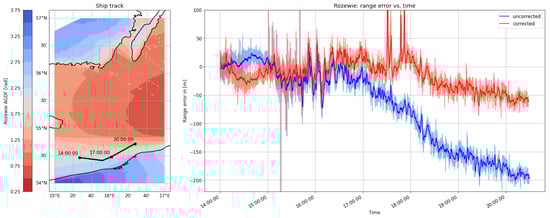 (Left) Track of the ship on 29 August 2020 on top of the AGDF map of the Rozewie MF R-Mode transmitter. (Right) Comparison of the range error for the Rozewie transmitter with AGDF (red) and without (blue). Light: raw samples; dark: average (60 s).