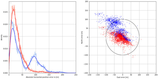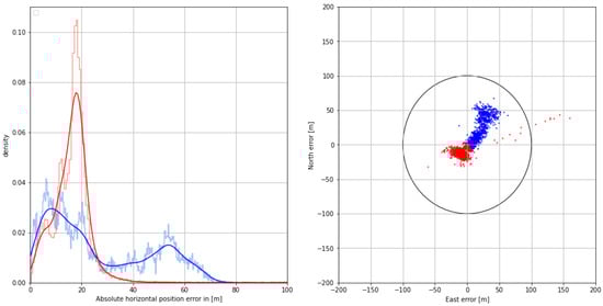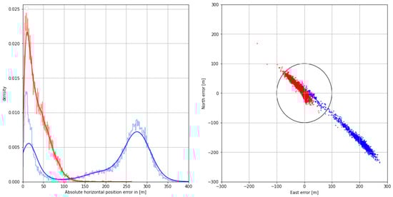 (Left) Histogram (pale color) and Gaussian kernel density estimate (firm color) of the corrected (red) and uncorrected (blue) horizontal position error on 31 August 2020. (Right) Scatter plot of the corrected (red) and uncorrected (blue) 2D position error in north and east direction. The circle represents the horizontal accuracy requirement of 100 m according to IALA R-129.
