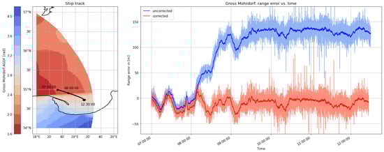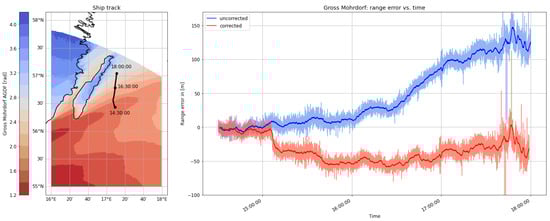 (Left) Track of the ship on 31 August 2020 on top of the AGDF map of the Gross Mohrdorf MF R-Mode transmitter. (Right) Comparison of the range error for the Gross Mohrdorf transmitter with AGDF (red) and without (blue). Light: raw samples; dark: average (60 s).