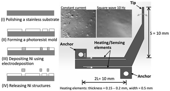 In the last few years, our group has developed electrothermal microactuators using an electrodeposition process to form the nickel structures as heating elements []. To actuate the system, a potential voltage is applied across the two bond pads, which induces a current through the heating elements at the middle. The current generates Joule heating, and as the temperature of the heating elements rises, they expand. This small elongation of the heating elements is amplified by the actuator’s mechanisms and displaces the actuator tip in the desired direction. A fabrication process using an electrodeposition technique and a configuration of nickel actuators is shown in Figure 1.