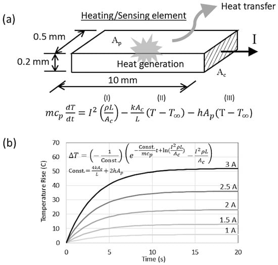 Mathematical model to predict the rate of heat transfer and temperature rise: (a) heating/sensing element, and (b) computational results.