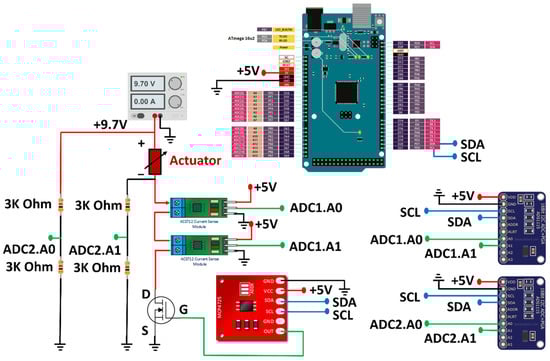 To actuate and monitor the microactuator, the experimental circuit was set up as shown in Figure 3b. The electrical current was passed through the microactuator structure using the current circuit control system. This control system consisted of a power supply, two hall-effect current sensors, and a MOSFET Vishay IRL510 (Vishay Intertechnology, Inc., Malvern, PA, USA) controlled using a signal from the Arduino MEGA 2560 through a 12-bit digital-to-analog converter MCP 4725 (Microchip, Tampa, FL, USA). The wiring diagram is illustrated in Figure 4. The power supply provided 9.7 volts to the circuit, and the Arduino MEGA 2560 controlled the amount of current by adjusting the time interval for triggering the MOSFET and the current amount to the MOSFET through the 12-bit digital-to-analog converter. When the MOSFET was off, there was no current in the circuit, and when the MOSFET was on, the current flowed through the circuit. To measure the current in the circuit, two hall-effect current sensors were set up in a differential-sensor configuration. These hall-effect current sensors were connected in series to the microactuator, but each sensor was connected to a different channel for measuring the differential current. This technique enhanced the sensitivity of the hall-effect current sensors with a noise-canceling technique. The uncertainty of the current sensors was approximately ±2 mA in experiments.