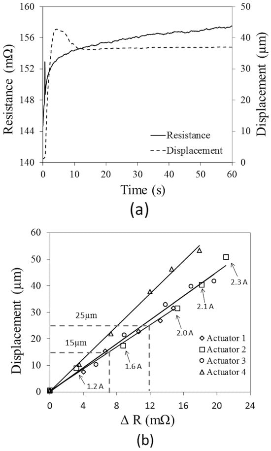 Experimental results to establish the control function: (a) instantaneous displacement and electrical resistance, and (b) relationship between the tip displacement and the resistance change at 15 s after applying current.