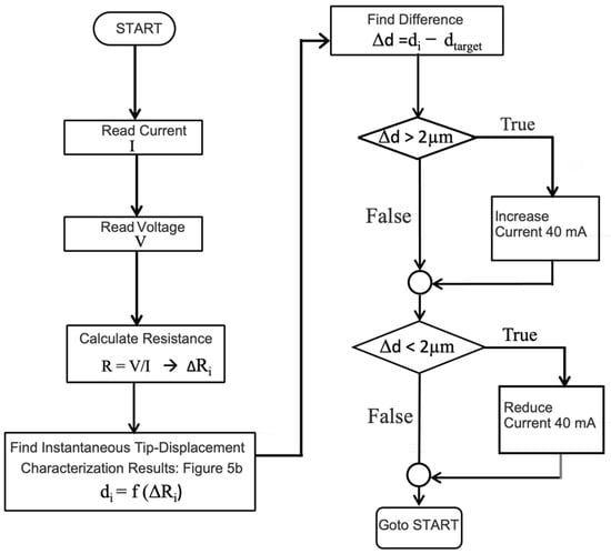 At this stage, a simple control algorithm was employed. Figure 6 shows a control algorithm that starts with readings of instantaneous voltage and a current of the heating/sensing element every 200 ms. Then, the resistance and subsequently displacement are calculated, and compared with the desired one from the calibrated relationship. If the microactuator has a shorter displacement compared to the desired one, the current with a stepwise increment of 40 mA will be fed to the heating/sensing element. Repeating the methods as mentioned, the current was continuously regulated to achieve the desired displacement.