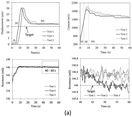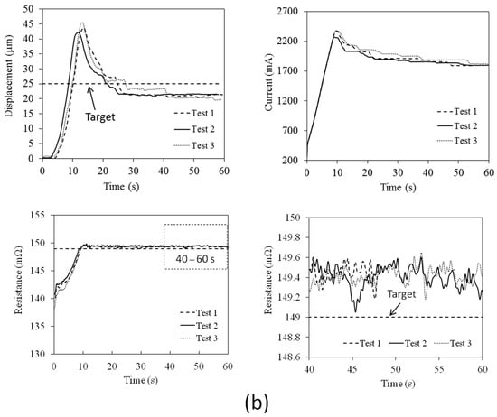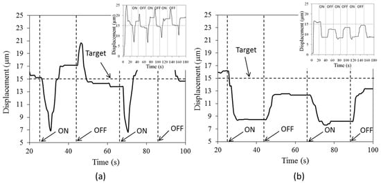In the first experiment, the results of the displacement of the tip, which were raised up suddenly and rebounded back to 15 and 25 µm and, after that, held constant, are shown in Figure 7a,b, respectively. The experiments were conducted at the same temperature (room temperature) with those in the characterization tests (as R0~140 mΩ). For the 15 µm test, at 5 s after the starting of control, the magnitude of electrical resistance reached the desired value, and afterward stayed almost constant (fluctuation of ±0.5 mΩ). On the other hand, the tip displacement sharply rose almost two times beyond, and then rebounded back to the desired one within 20 s with the position error less than 5 µm. The increment of the tip displacement had a similar trend to the increment of the current that was automatically adjusted. In addition, it was observed that the time interval for the resistance to reach the desired level was longer when the desired tip displacement was 25 µm. The driving current required to maintain the tip displacement of 15 and 25 µm was about 1.5–1.6 and 1.8–1.9 A, respectively. From the mathematical model, the temperature would be about 10 and 20 °C above room temperature for the two cases, respectively.