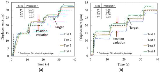 Figure 8a,b show the experimental results of the continuous step responses when the desired displacement was temporally increased. The increment of each step was 5 µm in every 10 s. It should be noted that the experiments were conducted at a relatively warmer initial condition than the heating/sensing elements (as R0~143–145 mΩ) since the system was operated continuously. Firstly, it was observed that the overshooting of the tip displacement almost disappeared. It suggested that the inertia effects on heat transfer were relatively less when the narrower stepwise increment of the tip displacement as well as resistance was required. With this continuous operation, the current required to maintain the tip displacement at 15 µm was only in the range between 1.2 and 1.3 A. It implied that the temperature of the heating/sensing elements slightly reduced from that in the previous experiment. On average, the feedback control provided a two times smaller error of position than the system driven using a feed-forward control since the system was less sensitive to the unintentional change in surrounding. The position variation in the feedback control was less than 3 µm.