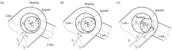 Figure 1 depicts a representation of the mathematical framework for modeling joint clearance. The center of bearing is , the radius is , the center of the journal is , the radius is , and the position vectors of the bearing and journal center in the global coordinate  are  and , respectively. Radial clearance of the joint is . Based on the varying relative positions of bearings and journals during motion, clearance joints are classified into three distinct categories: non-contact mode (Figure 1a), critical contact mode (Figure 1b), and contact mode (Figure 1c). In the continuous contact mode, the contact points on the bearing and journal are  and , respectively, and the contact point position vectors are  and  respectively.