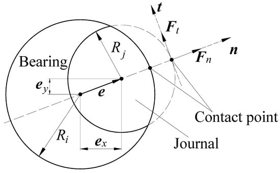 The tangential force  and normal force  during the collision process are shown in Figure 2. There has been some research on the characterization of contact forces during collision [,,,,]. Hertz [] laid the foundation for the characterization of elastic contact forces. However, the energy dissipation during collision is ignored in this study. Energy dissipation is considered in the study of Kelvin and Voigt, while the model cannot represent the nonlinearity and is only applicable to contacts with highimpact velocity []. The prevalent L-N model [] captures contact nonlinearity, enabling its application for characterizing low-speed collisions.