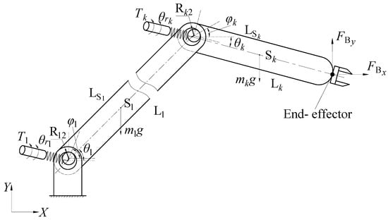 The model of the flexible-joint robots with clearances is demonstrated in Figure 3. Each link is driven by an independent motor, and the torsion spring between the rotor of the motor and the link is given to characterize the reducer, which reflects the joint flexibility. The representation of joint clearance in the figure is an exaggeration. The joint angle , the rotor angle , and the contact angle due to clearance  are the parameters considered in the modeling. The center of mass of the link is ;  and  are the components of the external force.