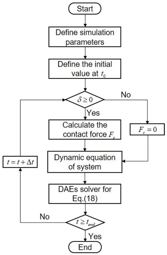 The links of the robot studied in this paper are rigid, joint clearance exists at joint 1, and joints 1 and 2 are considered to be flexible joints. Therefore, the mathematical model of the robot contains six variables. In this paper, MATLAB is employed to simulate the robot model. The simulation parameters and the flow chart of the simulation are given in Table 1 and Figure 5, respectively. The specific simulation calculation flow of dynamic analysis of a flexible-joint robot with clearance is as follows: