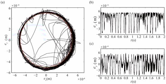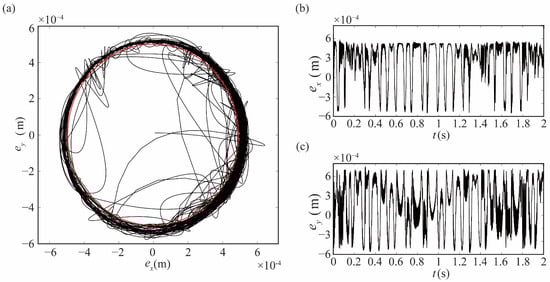 The dynamic behaviors of robots under different model parameters are explored in this research, and the main models are as follows: rigid-joint robot without clearance model (rigid-ideal, R-I), rigid-joint robot with clearance model (rigid-clearance, R-C), and flexible-joint robot with clearance model (flexible-clearance, F-C). The locus of the center of joint 1 is drawn in Figure 6a. The red line in the figure is the clearance circle, and the black is the locus of the center. Figure 6b,c show the motion locus in the X and Y direction, respectively. As seen from Figure 6, the motion mode between the bearing and the journal differs at different times. The locus outside the clearance circle indicates the continuous contact mode.