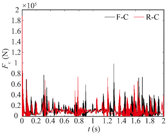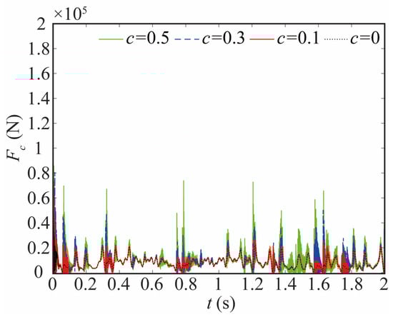 As depicted in Figure 19, the contact force at the joint exhibits a general upward trend, indicating an overall increase. Especially, the contact force at the peak increases significantly, as shown in Table 2. When c = 0.5, the frequency of the contact force at 1.41–1.72 s increases significantly. This indicates a rapid change in the motion state of the bearing and journal, which will decrease the stability of the system.