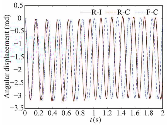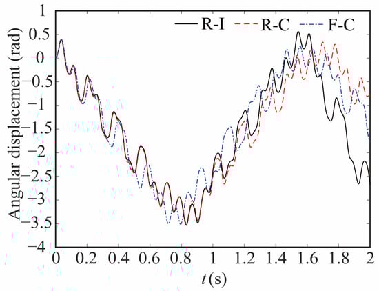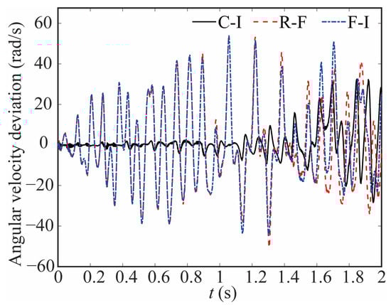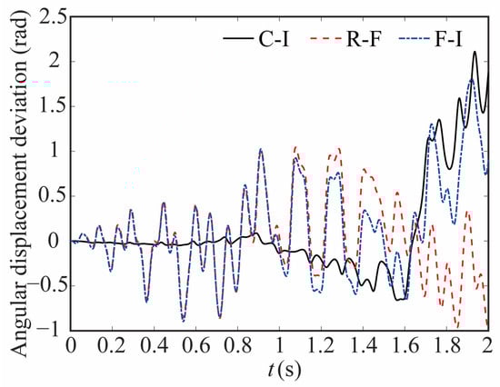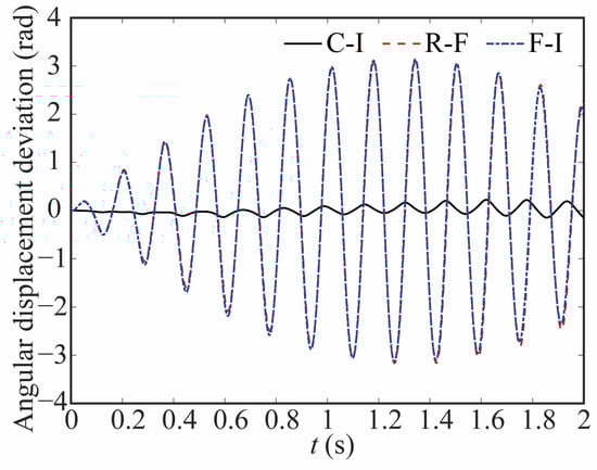 The comparison of the angular displacement of joint 1 for different robot models is shown in Figure 9. The deviation between different models is given in Figure 10. The black-solid line represents the deviation of angular displacement between the rigid-clearance model and the rigid-ideal model (C-I), the red-dashed line represents the difference between the rigid-clearance model and the flexible-clearance model (R-F), and the blue-dotted line represents the deviation between the flexible-clearance model and the rigid-ideal model (F-I). It can be clearly observed that the angular displacement of joint 1 is large when considering the clearance, and the deviation increases gradually with time. When considering flexible joints, the angular displacement of joint 1 also increases. The angular displacement of joint 1 is larger than that of the ideal model when the clearance and flexible joint are considered at the same time, but the angular displacement deviation at the same time is smaller than that of the rigid-clearance model. This is because the deviation caused by flexible joints neutralizes some caused by clearance.