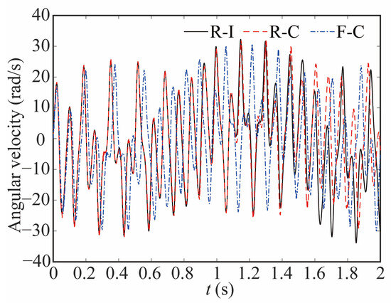 Figure 13 and Figure 14 illustrate the variations in angular velocity at joint 1 for various robot models, highlighting the discrepancies among them. The angular velocity is larger in the flexible-clearance model, and the lag phenomenon is also obvious. Taking into account the flexible joint and clearance, the angular velocity curve of the joint lags significantly and exhibits a diminished amplitude when compared to that of the rigid-ideal model.