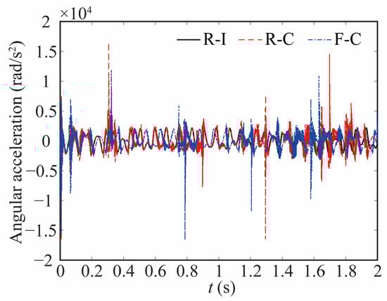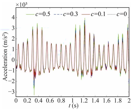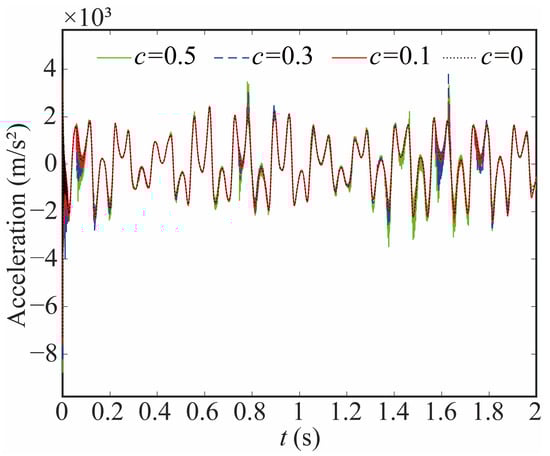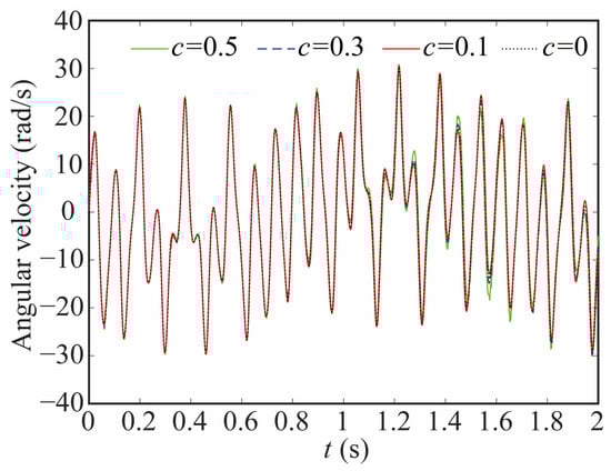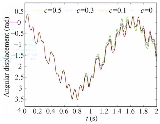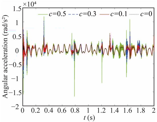 The variation in the joint contact force exerts a discernible influence on the motion state of the joint. As shown in Figure 20, Figure 21 and Figure 22, the increase in the clearance value corresponds directly to an augmentation in both angular displacement and angular velocity, and the change between 0 and 0.8 s is not apparent. There is a significant increase after 0.8 s. As the clearance size increases, the angular acceleration of the joint and the magnitude of the acceleration peak undergo a corresponding augmentation. When c = 0.5, the frequency of the angular acceleration within 1.41–1.72 s increases. This observation aligns with the varying force trend and further indicates the direct correlation between changes in contact force and the stability of the joint. Larger clearance leads to poor system performance.