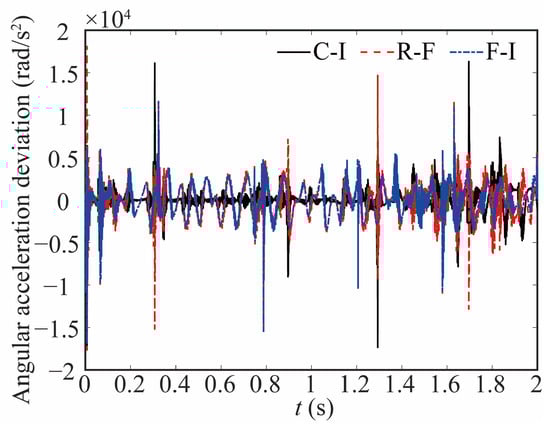 Figure 15 and Figure 16 show the change in the angular acceleration and the deviation, respectively. As seen from Figure 15 and Figure 16, the angular acceleration curve of joint 1 for the rigid-ideal model is relatively smooth. When the influence of clearance is taken into account, the amplitude of angular acceleration increases, and the curve shows impact peaks. The appearance of a peak means that there is a large contact force, which affects the stability of the robot. The value of the peak is relatively reduced when the flexible joint is considered. These things considered, the curve has a significant difference and noticeable lag when the flexible joint and clearance are coupled.
