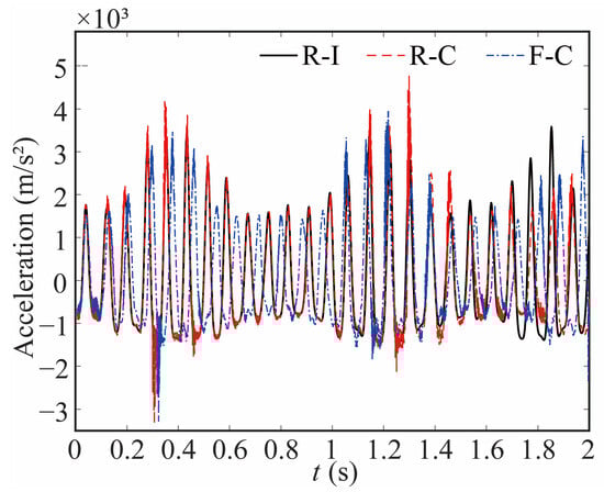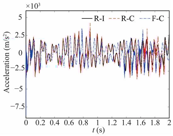 Flexible joints and clearance of the robot not only affect the motion of the joint but also greatly influence the dynamic characteristics of the end-effector. In Figure 17 and Figure 18, the acceleration curves of the end-effector are depicted. Clearance and flexibility exert a great influence on the acceleration of the end-effector. When clearance is taken into account, peaks and an augmentation in acceleration emerge, resulting in a considerable inertial force exerted on the robot and subsequently affecting its stability and accuracy.